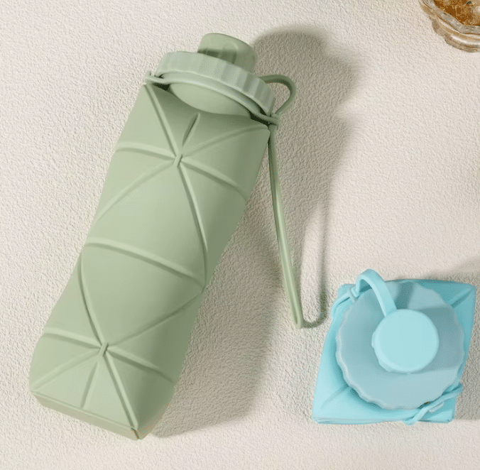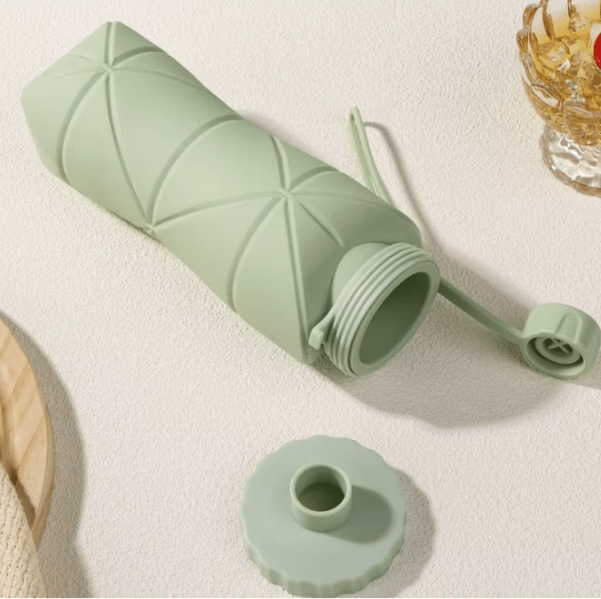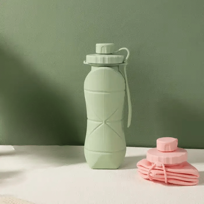 Conception pliable en silicone qui réduit l’encombrement une fois la bouteille vide.